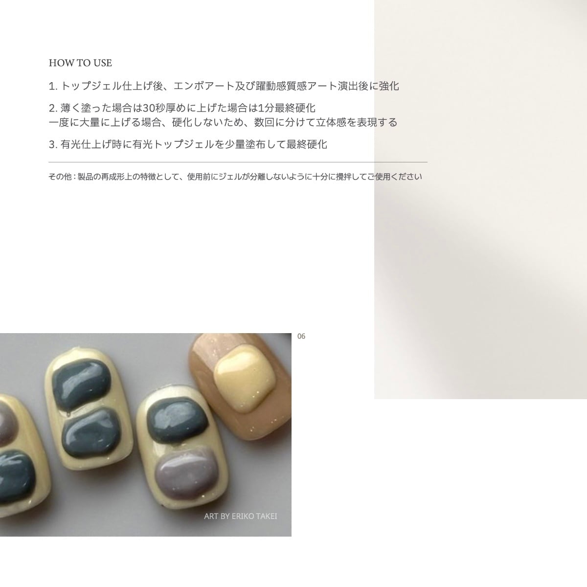 流れにくく造形しやすい処方と、熱を感じにくいノーヒート設計で理想的な操作性と仕上がりを実現しました。まるで美術館の作品のように、立体感を楽しむためのジェルです。